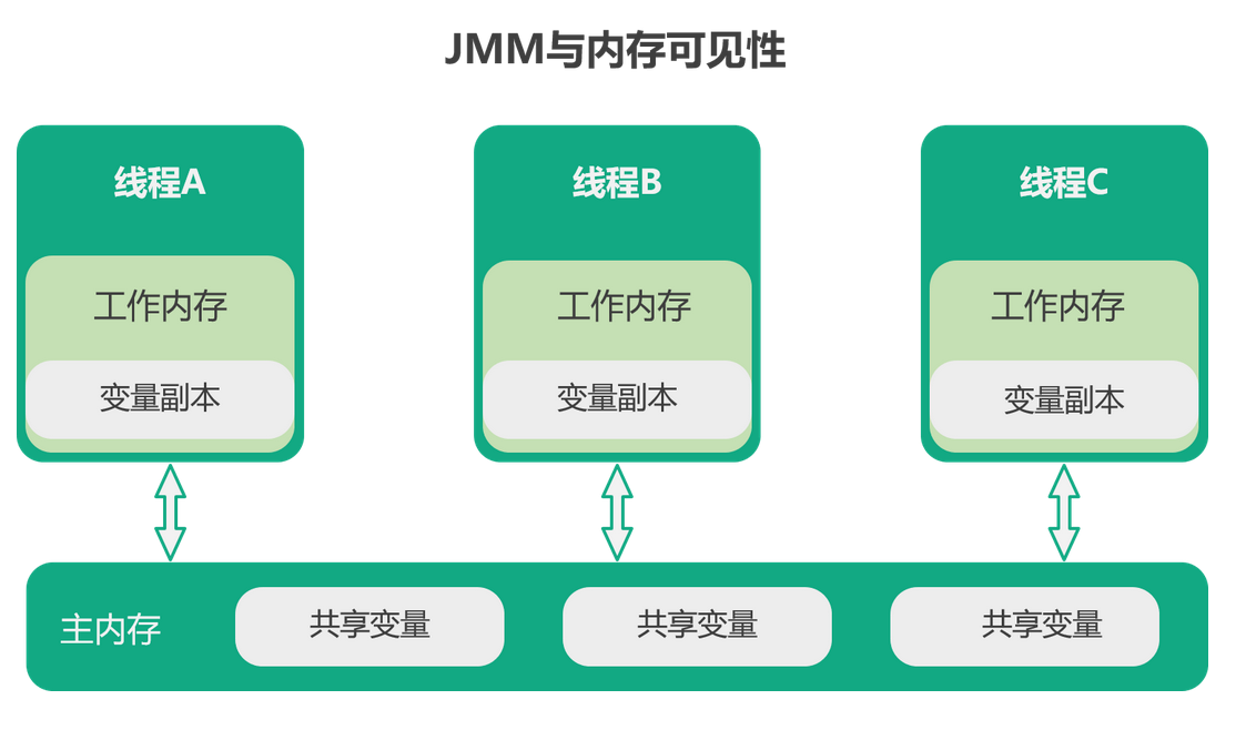 JMM 是 Java 内存模型,与刚才讲到的 JVM 内存模型是两回事,JMM 的主要目标是定义程序中变量的访问规则,如下图所示,所有的共享变量都存储在主内存中共享。每个线程有自己的工作内存,工作内存中保存的是主内存中变量的副本,线程对变量的读写等操作必须在自己的工作内存中进行,而不能直接读写主内存中的变量。