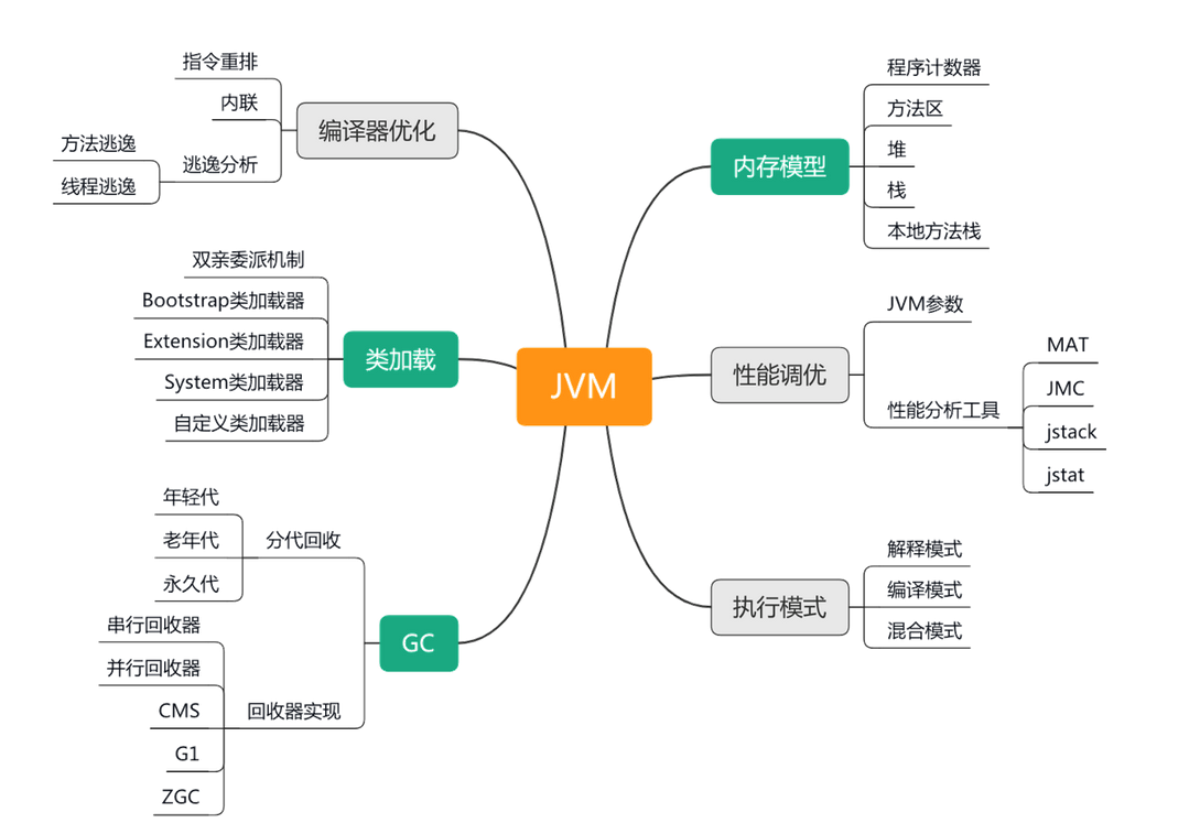 如上图所示,JVM 知识点有 6 个大方向,其中,内存模型、类加载机制、GC 垃圾回收是比较重点的内容。性能调优部分偏重实际应用,重点突出实践能力。编译器优化和执行模式部分偏重理论基础,主要掌握知识点。