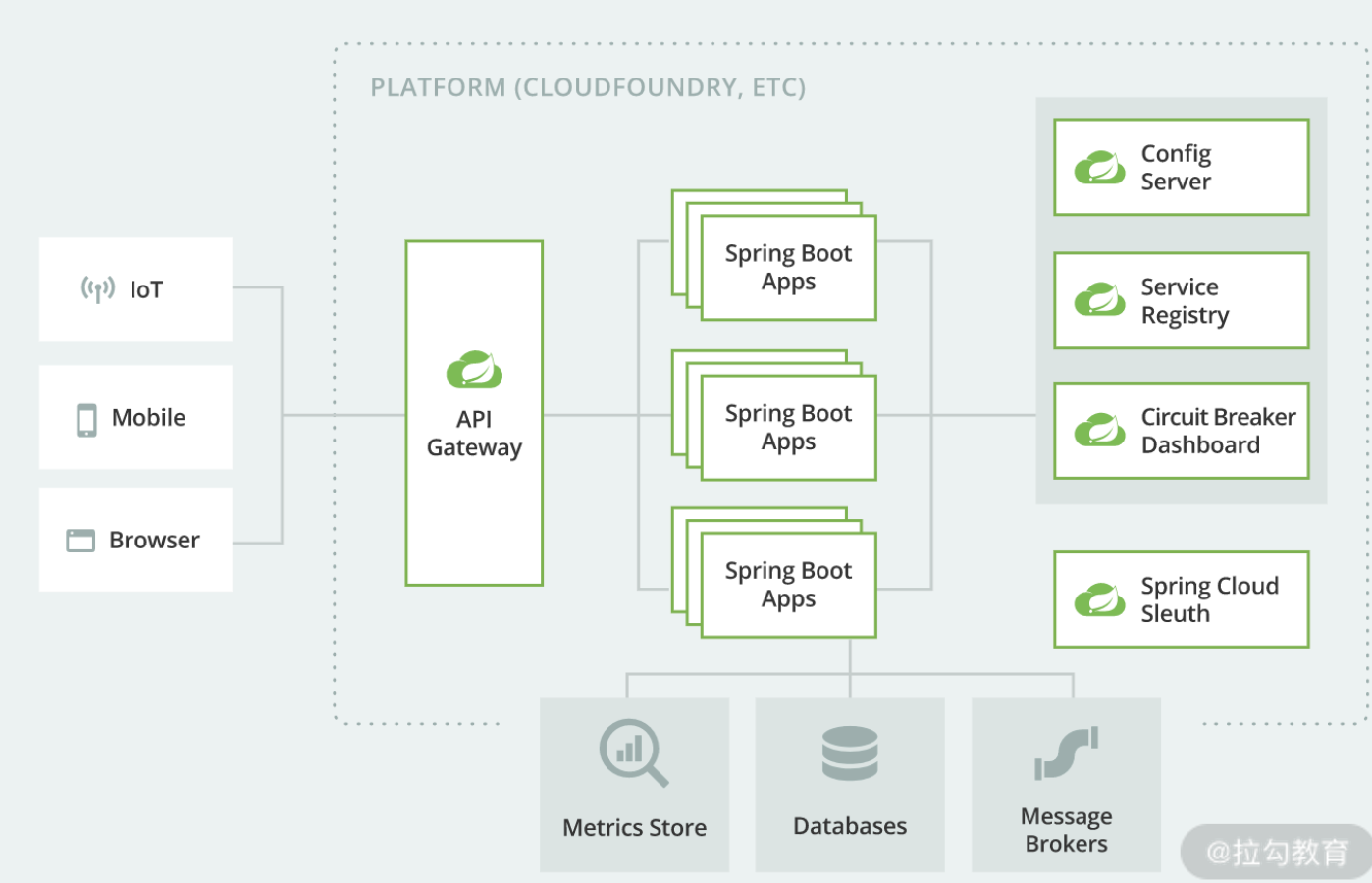Spring 是整个微服务开发生态的基石,在此基础上 Spring 经过封装和简化,形成了Spring Boot 敏捷开发框架,而 Spring Cloud 开发微服务则必须掌握 Spring Boot,如果此时你对Spring 以及 Spring Boot 还不了解,可以在拉勾教育找到相关课程补充学习。