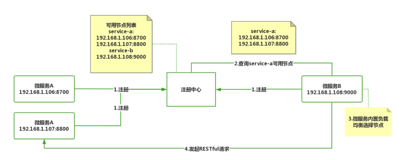 负载均衡(Load Balance):负载均衡器解决了问题 2。通常在微服务彼此调用时并不是直接通过IP、端口直接访问,而是首先通过服务名在注册中心查询该服务拥有哪些可用节点,然后注册中心将可用节点列表返回给服务调用者,这个过程称为“服务发现”。因服务高可用的要求,服务调用者会接收到多个可用节点,必须要从中进行选择,因此在服务调用者一端必须内置负载均衡器,通过负载均衡策略选择适合的节点发起实质的通信请求。