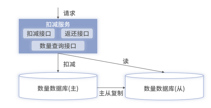 基于上述特性实现的架构方案如下图 1 所示,它包含一个扣减服务和一个数量数据库。