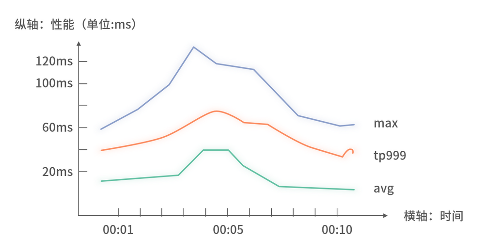 在性能监控里,有几个通用的运行状态数据:平均性能(AVG)、Max 以及TP999 。下面我们具体看一下它们的含义与区别。