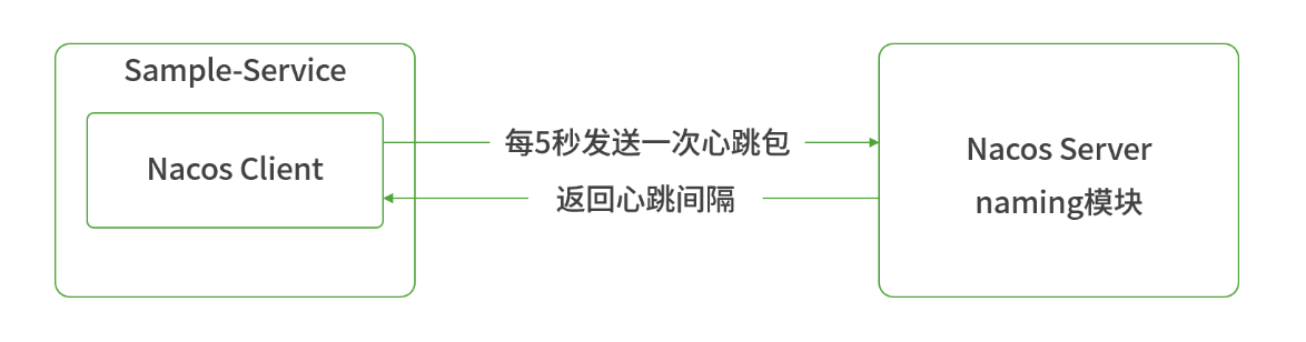 下图阐述了微服务与 Nacos 服务器之间的通信过程。在微服务启动后每过5秒,会由微服务内置的 Nacos 客户端主动向 Nacos 服务器发起心跳包(HeartBeat)。心跳包会包含当前服务实例的名称、IP、端口、集群名、权重等信息。