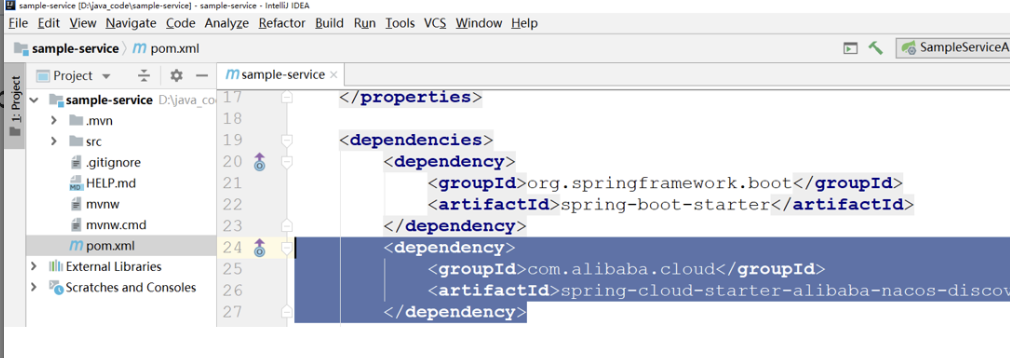 工程创建成功,打开 pom.xml 文件,确认 Maven 依赖 nacos-discovery,说明服务已内置 Nacos 客户端成功。