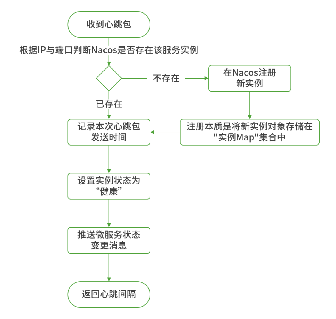 23:11:38.847 DEBUG 10720 --- [ing.beat.sender] s.n.www.protocol.http.HttpURLConnection : sun.net.www.MessageHeader@3521283812 pairs: {PUT /nacos/v1/ns/instance/beat?app=unknown&serviceName=DEFAULT_GROUP%40%40sample-service&namespaceId=public&port=9000&clusterName=DEFAULT&ip=192.168.47.1 HTTP/1.1: null}{Content-Type: application/x-www-form-urlencoded}{Accept-Charset: UTF-8}{Accept-Encoding: gzip,deflate,sdch}{Content-Encoding: gzip}{Client-Version: 1.3.2}{User-Agent: Nacos-Java-Client:v1.3.2}{RequestId: ccb6a586-897f-4036-9c0d-c614e2ff370a}{Request-Module: Naming}{Host: 192.168.31.102:8848}{Accept: text/html, image/gif, image/jpeg, *; q=.2, */*; q=.2}{Connection: keep-alive}naming 模块在接收到心跳包后,会按下图逻辑处理心跳包并返回响应: