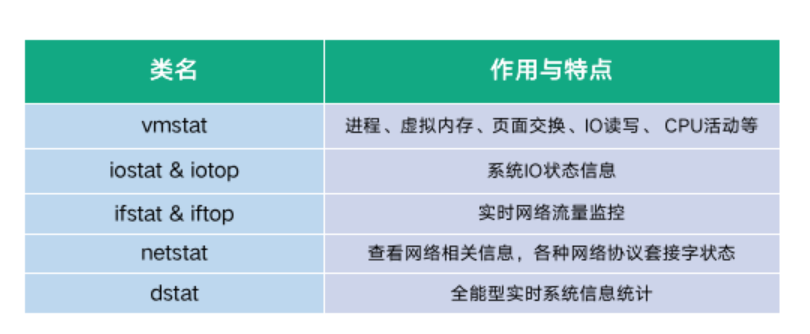 来看 Linux 系统下常用的分析工具。首先是如下图表格中列出的 stat 系列。