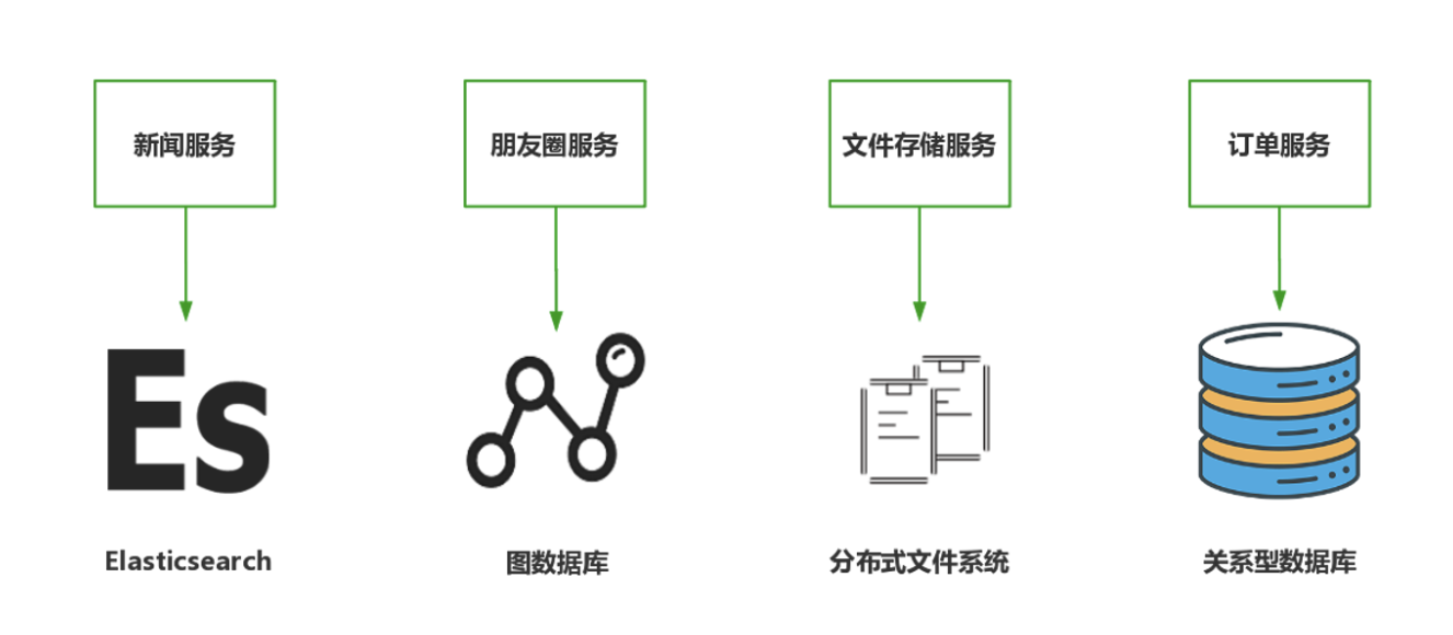 第三点,微服务确保独立的数据存储。 数据是任何系统最重要的资产。以往单体应用通常会选择 MySQL 这种关系型数据库作为数据的唯一存储,这样做的好处是涉及多表操作时,利用数据库自带的事务机制便可最大程度保证数据完整性。但这样做却存在诸多问题,以下图为例,不同的微服务对数据存储的需求也是不同的,订单服务需要 MySQL 数据保存订单与订单明细;新闻服务需要Elasticsearch提供全文检索支持;朋友圈需要图数据库表达现实世界人际关系;文件存储服务则需要分布式文件系统。如果将所有数据都揉在 MySQL 中使用会变得十分蹩脚,好的做法是为每一个微服务提供符合自身业务特性的数据库。