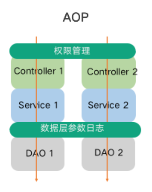 AOP,就是面向切面编程。如下图所示,一般我们的程序执行流程是从 Controller 层调用 Service 层、然后 Service 层调用 DAO 层访问数据,最后在逐层返回结果。这个是图中向下箭头所示的按程序执行顺序的纵向处理。