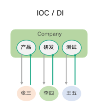 IoC,也就是控制反转,如下图,拿公司招聘岗位来举例。假设一个公司有产品、研发、测试等岗位。如果是公司根据岗位要求,逐个安排人选,如图中向下的箭头,这是正向流程。如果反过来,不用公司来安排候选人,而是由第三方猎头来匹配岗位和候选人,然后进行推荐,如图中向上的箭头,这就是控制反转。