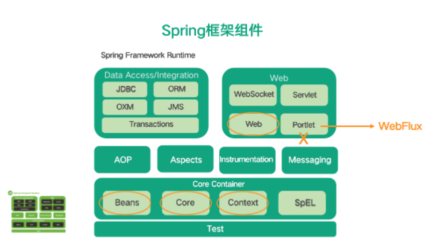 再来看到 Spring 框架,下图中列出了 Spring 框架主要包含的组件。这张图来自 Spring4.x 的文档。目前最新的 5.x 版本中右面的 Portlet 组件已经被废弃掉,同时增加了用于异步响应式处理的 WebFlux 组件。这里不需要对所有的组件都详细了解,只需要重点了解最常用的几个组件实现,以及知道每个组件用来实现哪一类功能就可以了。