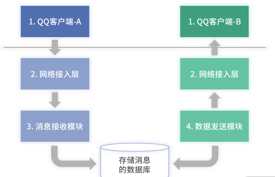 图中编号 1 的模块为安装在电脑里的 QQ 客户端,它主要给用户提供可视化的聊天界面,以及发送和接收其他用户的消息。