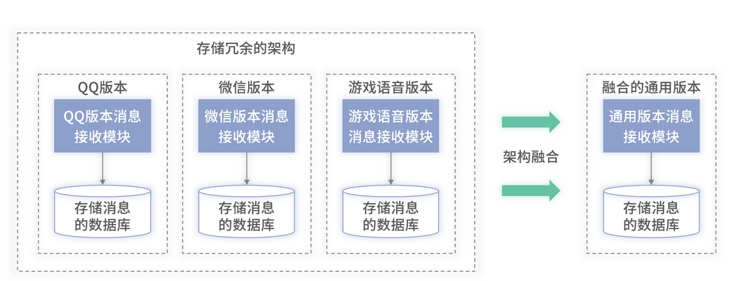 以上述消息接收模块为例,它包含了一个代码进程和对应的消息存储(假设为 MySQL)。为了解决此模块的重复,可以合并 QQ、微信和游戏语音里此模块的代码。同时在前期设计时,各个业务只考虑自己的消息格式,所以它们的数据库的表结构是偏定制的,无法直接被复用,因此在重构时,还需要设计一套全新的、兼容原有三个版本的数据库。此时消息接收模块的重构架构如下图 8 所示:
