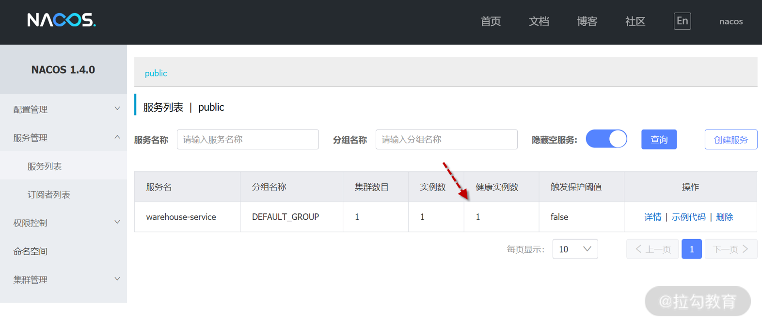 }可以看到 WarehouseController 就是普通的 Spring MVC 控制器,对外暴露了 stock 接口,当应用启动后,查看 Nacos 服务列表,已出现 warehouse-service 实例。