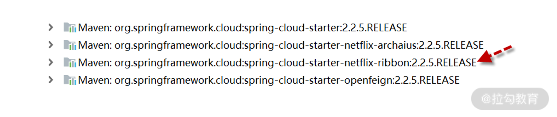 </dependency>这里关键在于服务消费者依赖了 spring-cloud-starter-openfeign,在 Spring Boot 工程会自动引入 Spring Cloud OpenFeign 与 Netflix Feign 的 Jar 包。这里有个重要细节,当我们引入 OpenFeign 的时候,在 Maven 依赖中会出现 netflix-ribbon 负载均衡器的身影。