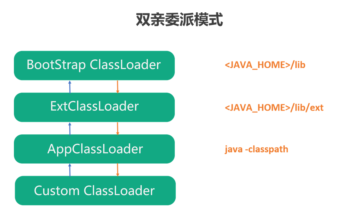 Java 的类加载使用双亲委派模式,即一个类加载器在加载类时,先把这个请求委托给自己的父类加载器去执行,如果父类加载器还存在父类加载器,就继续向上委托,直到顶层的启动类加载器,如上图中蓝色向上的箭头。如果父类加载器能够完成类加载,就成功返回,如果父类加载器无法完成加载,那么子加载器才会尝试自己去加载。如图中的桔黄色向下的箭头。