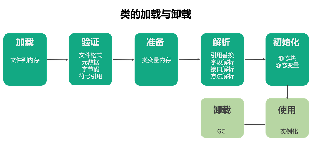 类的加载指将编译好的 Class 类文件中的字节码读入内存中,将其放在方法区内并创建对应的 Class 对象。类的加载分为加载、链接、初始化,其中链接又包括验证、准备、解析三步。如下图所示。