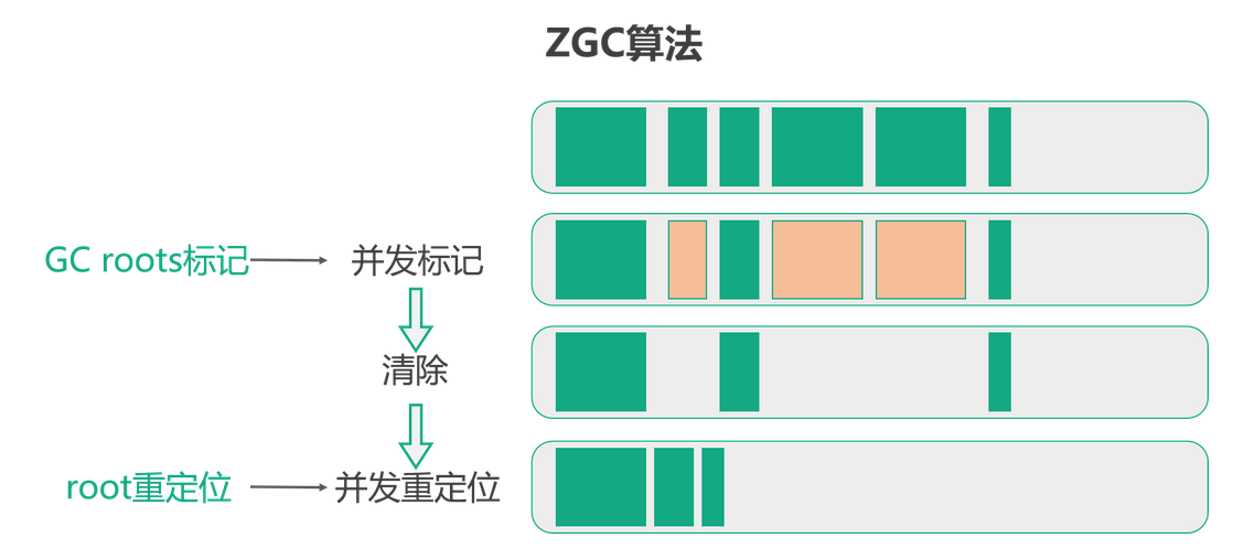 虽然 ZGC 的大部分时间是并发进行的,但是还会有短暂的停顿。来看一下 ZGC 的回收过程。