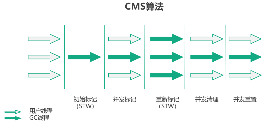 基于分代回收理论,详细介绍几个典型的垃圾回收算法,先来看 CMS 回收算法。CMS 在 JDK1.7 之前可以说是最主流的垃圾回收算法。CMS 使用标记清除算法,优点是并发收集,停顿小。