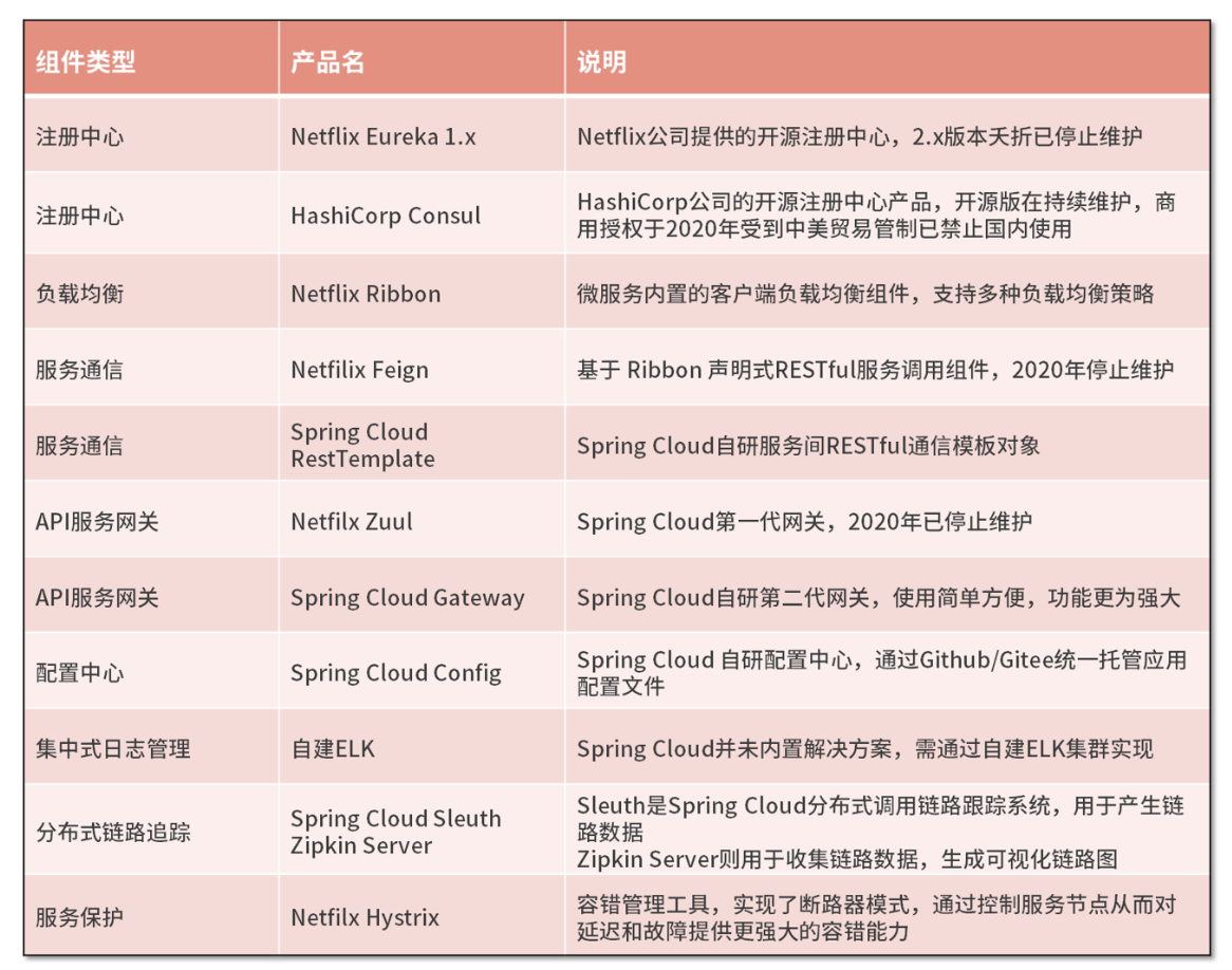 不过这里有一点需要注意,Spring Cloud 并不是完全由 Spring 机构自主开发的,秉持不重复造轮子的理念,Spring 机构整合了多家厂商的优秀开源产品,比如注册中心就选用了 Netflix 的 Eureka,在此基础上进行整合形成了完整的 Java 微服务架构解决方案。刚才我们列举出来的 8 个微服务的标准组件在 Spring Cloud 中都有对应的具体实现,值得注意的是同一类组件 Spring Cloud 可能给出多种不同的开源产品供我们选择,这些产品在 Spring Cloud 下是彼此兼容的。