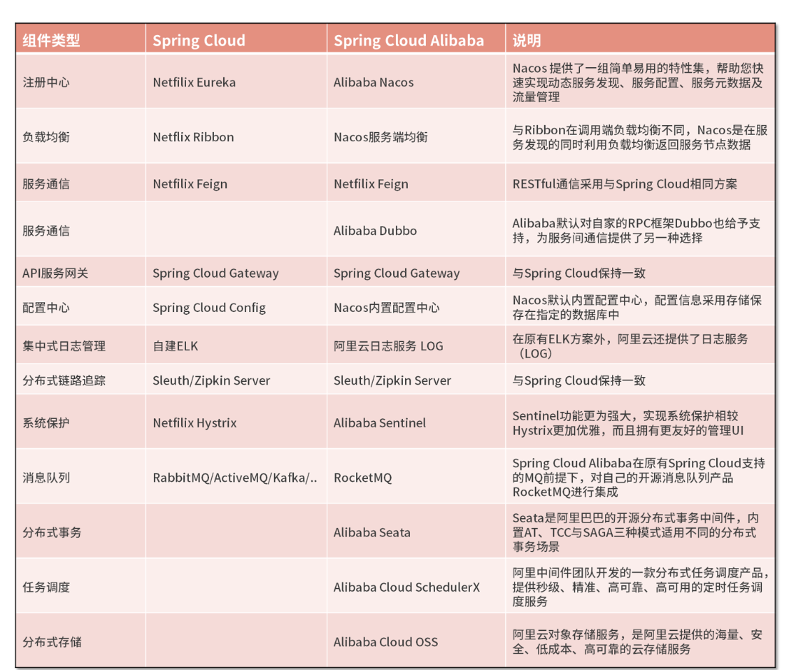 下面是 Spring Cloud 与 Spring Cloud Alibaba 的对比表格。
