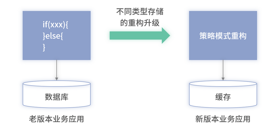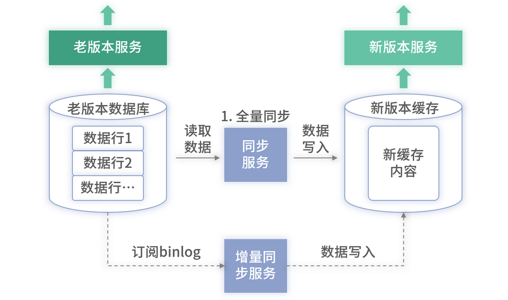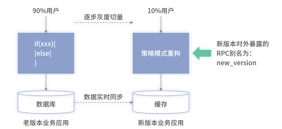 上述的架构中,左边部分是老版本未重构的服务及对应的老数据存储(后续称为老存储),图中右边部分部署的是升级重构后的新版本的服务和对应的新版本存储(后续称为新存储)。这个存储可以是缓存或者是表结构不同的数据库。