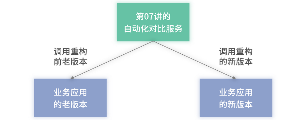 因此就需要借助自动化的方式进行测试,我想你还记得在“第 07 讲:基于流量回放的自动化回归测试”的内容。在完成全量数据同步后,可以录制老版本服务的流量,并进行自动化测试回归,它的架构如下图 6 所示: