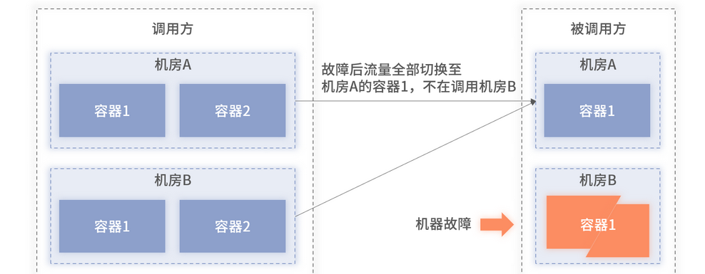 其次,机房内至少部署两台及以上机器。 这里再多啰唆一句,上述第一条要求至少双机房部署,并不是两个机房各部署一台机器即可,而是要在同一个机房里至少部署两台机器,保障机房内机器互相灾备。此方式可以防止当某一台机器故障后,出现整个机房全部失联,进而将调用方的所有的流量都打至另外一个机房,引起请求的性能和稳定性下降,因为跨机房的请求的网络传输时间更长。单机房部署单容器故障时导致的跨机房调用的架构如下图 3 所示,可以看到故障后,调用方的所有流量全部都路由至被调用方的单个机房里。