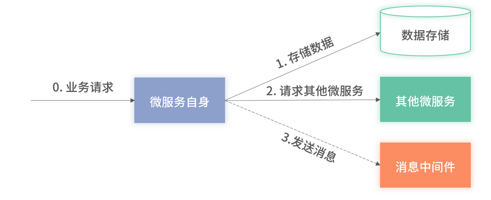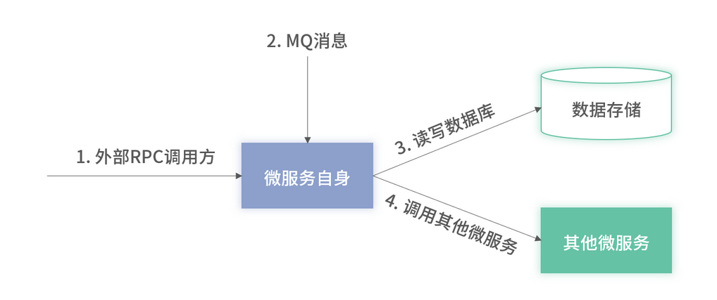 这里我仍基于“第 17 讲”里介绍的微服务骨架图,如下图 5 所示,从微服务的入口、微服务自身及微服务的依赖这三个方面,讲解如何应用上述三种监控方式,以及对应的一些最佳实践准则,从而发现微服务里的各种潜在问题。