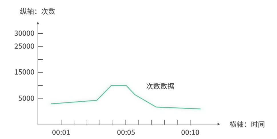 次数监控中被监控体就是次数,具体指微服务里各项代码逻辑运行的次数,可以是微服务对外提供接口的被调用次数、某一个方法被执行的次数。它的示意图如下图 2 所示,其中 Y 轴表示在指定间隔内,被监控体的总体运行次数。