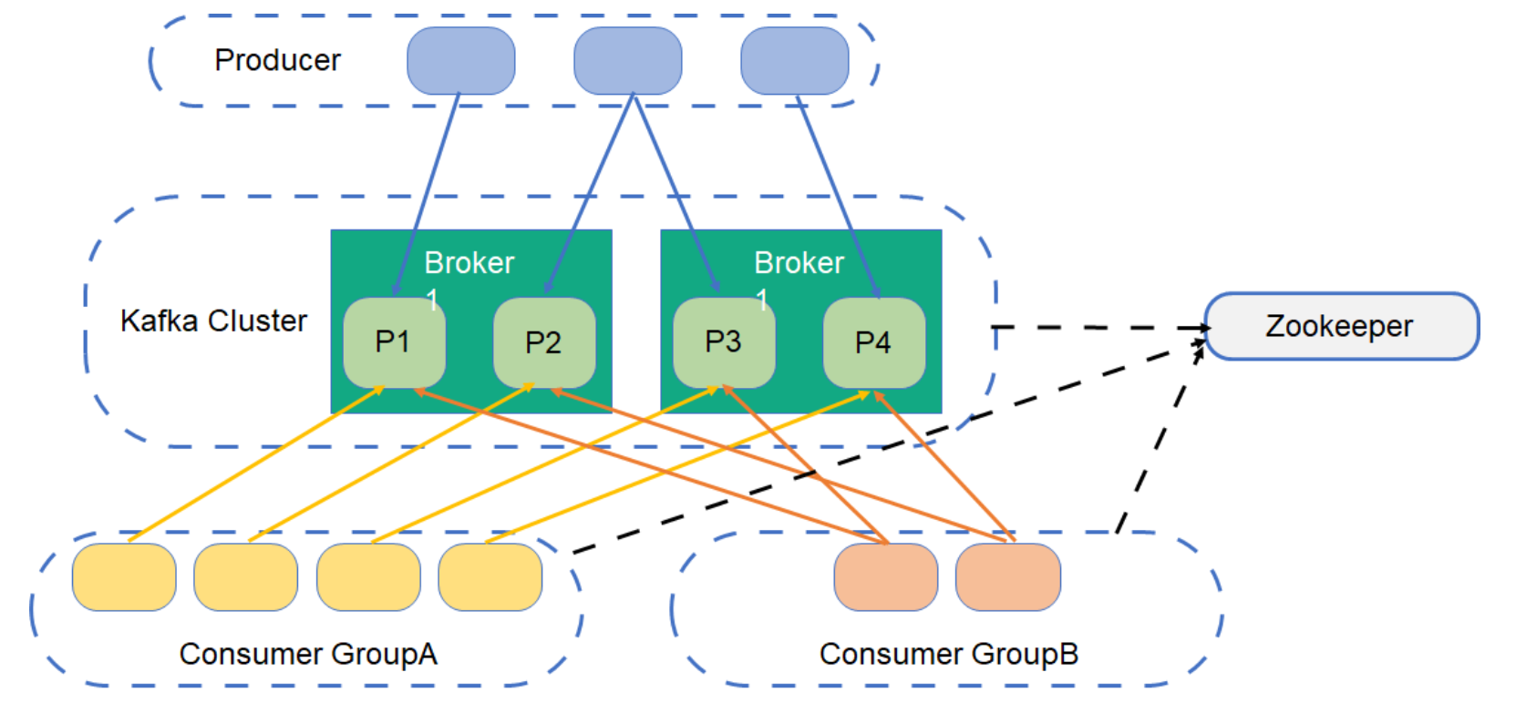 Kafka 通过对消费方进行分组管理来支持消息一写多读,流程如下图所示。