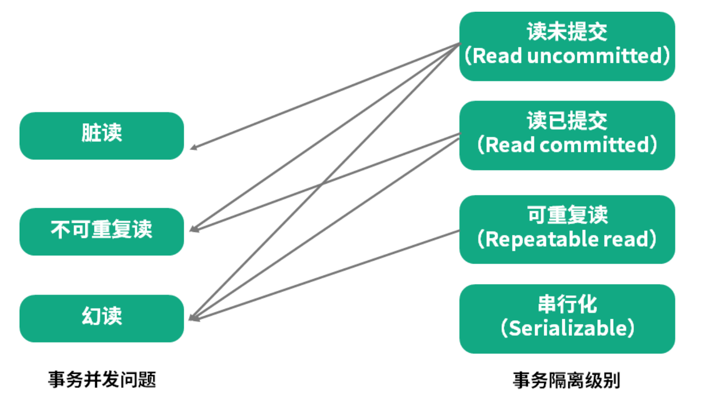 事务的四种隔离级别可以解决上述几种并发问题。如上图右侧内容所示,由上到下,四种隔离级别由低到高。