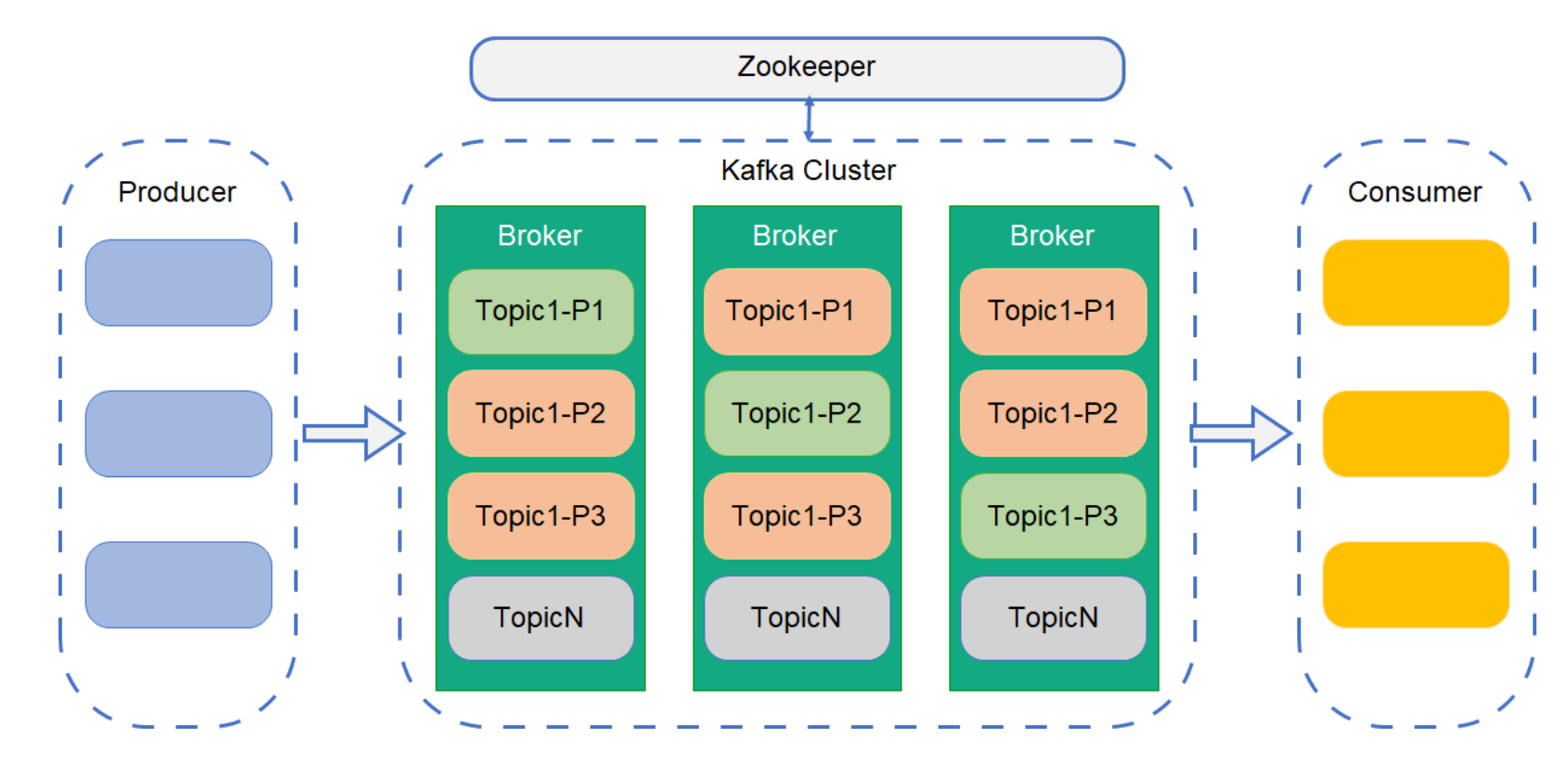 如图中间部分,Partition 分布于多个 Broker 上。图中绿色的模块表示 Topic1 被分为了 3 个 Partition。每个 Partition 会被复制多份存在于不同的 Broker 上,如图中红色的模块,这样可以保证主分区出现问题时进行容灾。每个 Broker 可以保存多个 Topic 的多个 Partition。