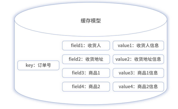 参考数据库的多张表设计,缓存中也可以进行多部分存储。在 Redis 中,可以采用 Hash 结构。对于一个订单下的不同表的数据,在 Redis 中存储至各个 field 下即可,同时 Redis 支持对单个 field 的局部更新。结构如下图 5 所示: