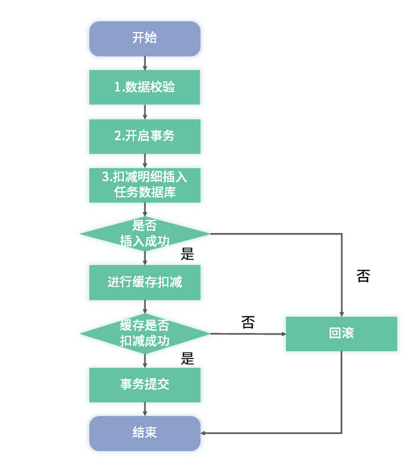 假设数据库插入扣减明细失败,则事务回滚,任务表中无新增数据,数据一致,无任何影响。