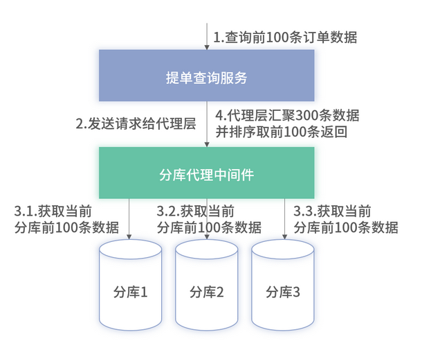 select 订单信息 from t_order order by createdTime limit 100在没有路由字段时,分库分表的前 100 个订单如何获取呢?因为在极端情况下全局的前 100 条数据可能都分布在某一个分库里,为了保障一定能够获取到全局的前 100 条数据,代理层需要向每一个分库(上述有三个分库)都获取 100 条数据,并在代理层进行汇总排序,如下图 3 所示: