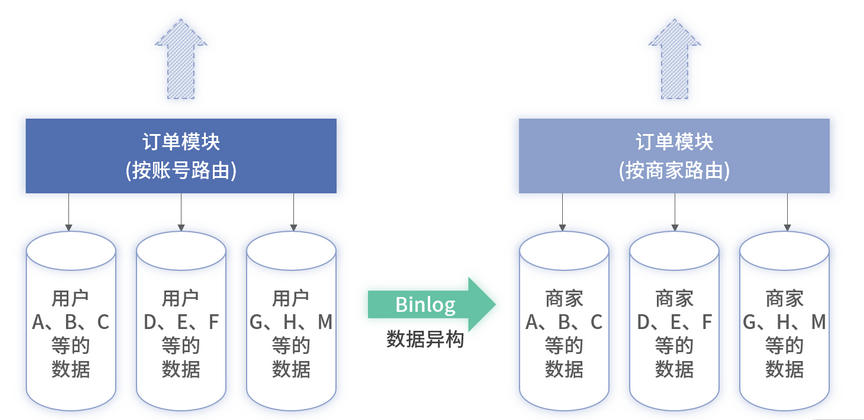 为了满足和原有分库维度不一样的查询,最简单的方式是按新的维度异构一套数据,它的架构如下图 1 所示,数据异构可以采用在本专栏模块二中介绍的 Binlog 进行处理。