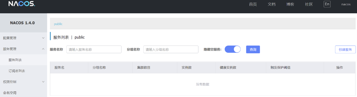 目前因为没有任何微服务注册,右侧服务列表是空的。那如何让微服务在 Nacos 中注册呢?下一小节咱们继续讲解。
