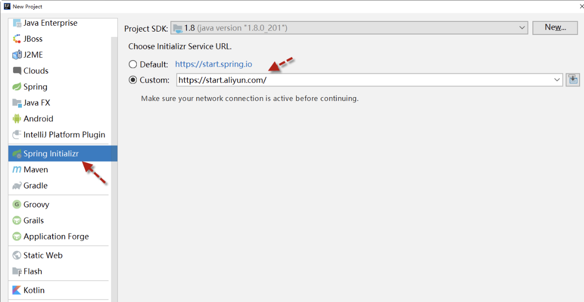 下图是 SpringBoot 工程向导,右侧选中 Custom,写入阿里云地址http://start.aliyun.com,默认的 https://start.spring.io。 这里需要连接 spring 官方服务器,因为网络原因经常无法访问,所以采用国内阿里云镜像生成工程初始代码。