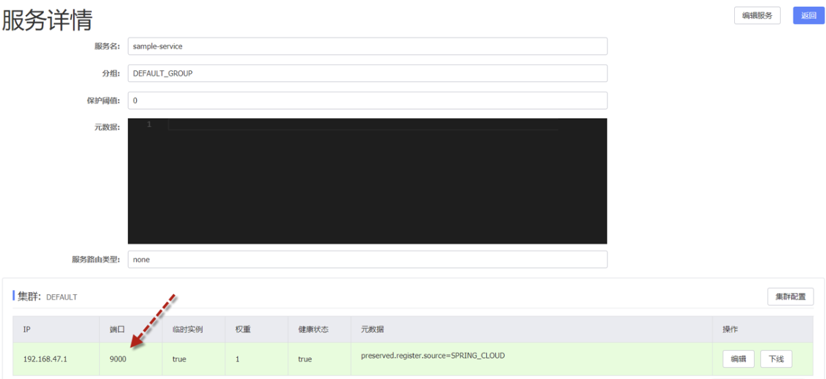 点击列表右侧“详情按钮”就会出现详细信息,在服务详情下清晰列出 sample-service 服务目前可用实例的 IP 及服务端口。