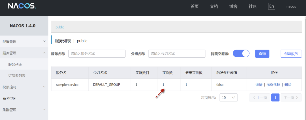 INFO 14188 c.l.s.SampleServiceApplication : Started SampleServiceApplication in 4.911 seconds (JVM running for 6.039)浏览器打开http://192.168.31.102:8848/nacos,查看服务列表时发现 sample-service 服务已出现。