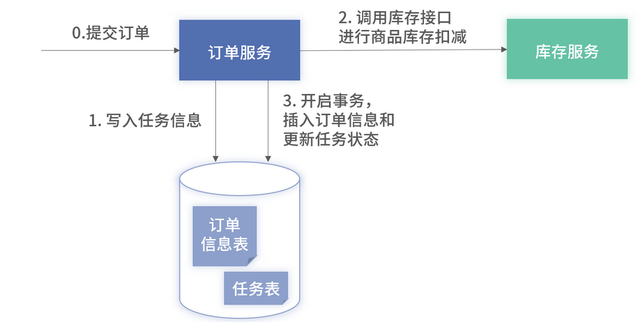 在接收到下单请求后,在调用任何外部 RPC 前,先将此订单的相关信息,如此次用户购买的商品、商品数量、用户账号、此次订单的编号等信息写入新增的任务表中。