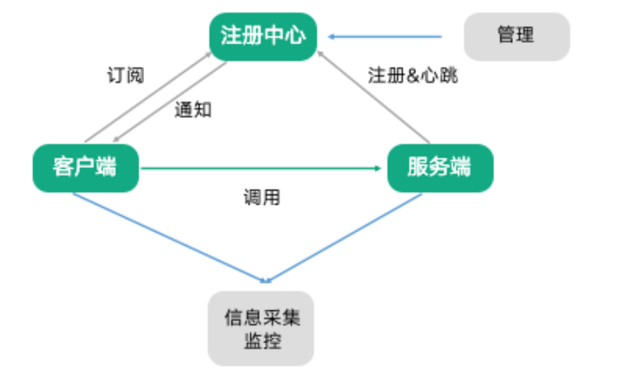 另外一般的 RPC 框架都提供了完整的服务治理能力,因此会有额外的管理模块和信息采集模块来监控、管理服务。如图中灰色的模块所示。