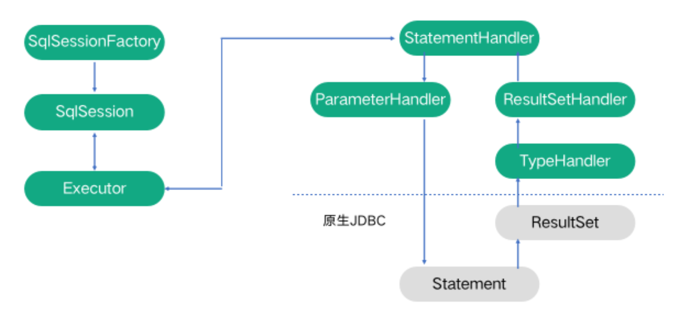 SQL 语句是通过 SqlSession 中的 Executor 来执行,Executor 根据 SqlSession 传递的参数执行 query() 方法,然后创建一个 StatementHandler 对象,将必要的参数传递给 StatementHandler,由 StatementHandler 来完成对数据库的查询。