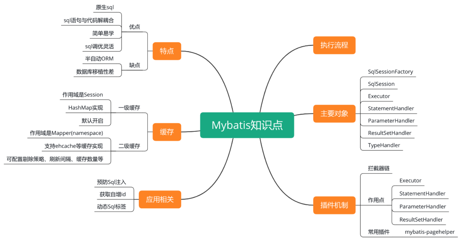 下面我们来看 ORM 框架 MyBatis,它的知识结构图如下所示。首先要了解它的特点,可以和 Hibernate 来对比进行理解。
