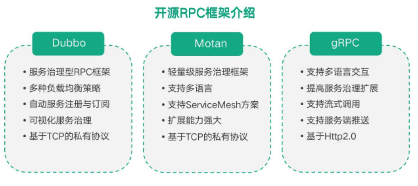 来看三款比较有特色的主流 RPC 框架,如下图所示。