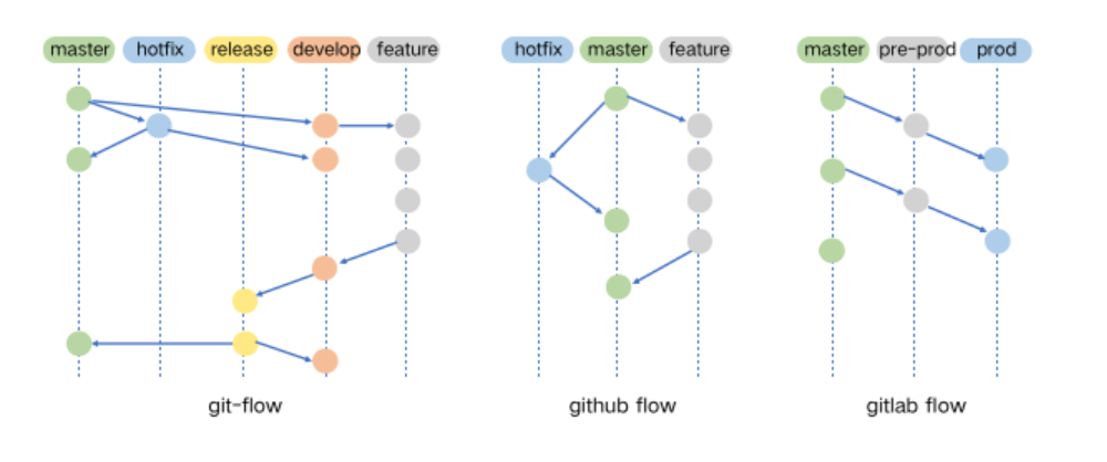 使用 Git 进行团队协作开发时,多人协作、多分支开发是很常见的。为了更好得管理代码,需要制定一个工作流程,这就是我们说的工作流,也可以叫分支管理策略。常见的基于 Git 的工作流有 Git-flow工作流、GitHub 工作流和 GitLab 工作流,如下图所示。