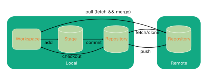 Git 对版本是分布式管理,因此有四个保存数据的区域,如下图中浅绿色的部分,分别是本地工作区 Workspace、本地暂存区 Stage、本地仓库和远程仓库。