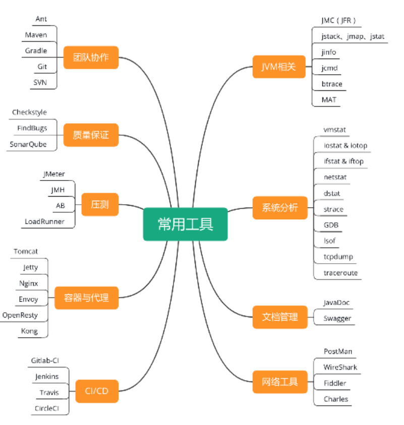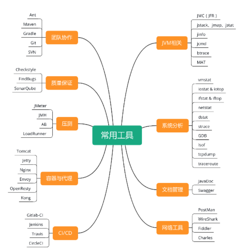 说明:这里列出的都是一些相对独立的工具或者命令,不包括像 ZK、Redis 这样的服务,以及像 Spring 这类的框架。这些工具都是各自类型中最常用的,该图不是以全面为目的。