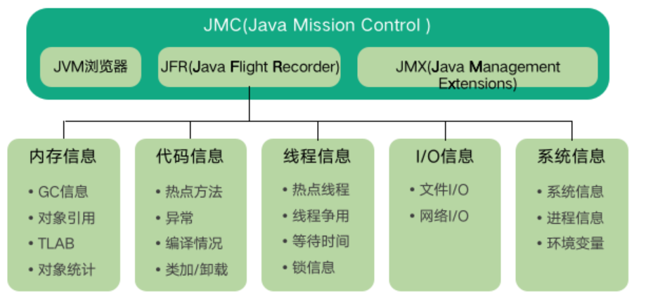 如下图所示,JFR 可以采集、分析五大类信息。