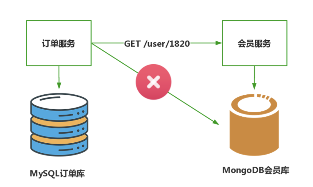 SELECT order.* , member.* FROM order,member WHERE order.member_id = member.member_id但在微服务架构下,因为数据库绝不允许其他团队访问,关联查询只能变为 API 调用形式,程序实现层面比单库复杂不少。